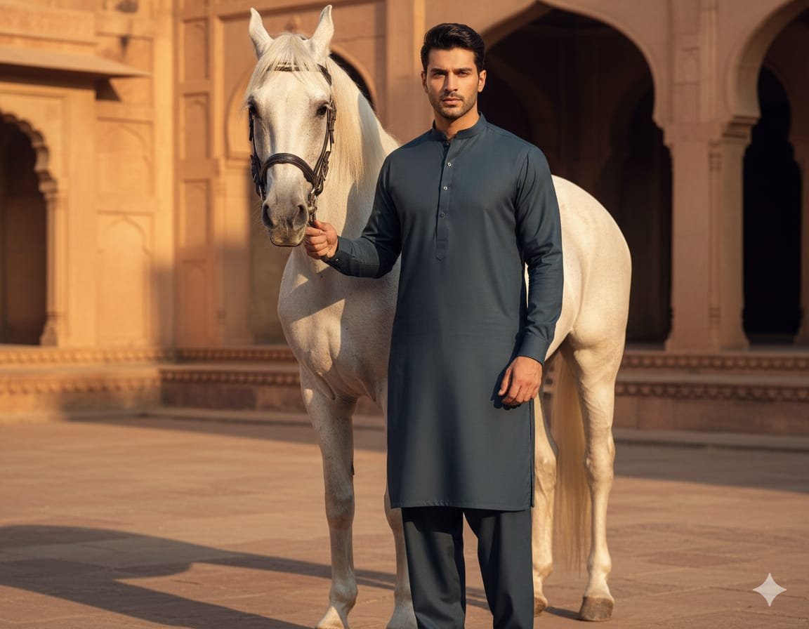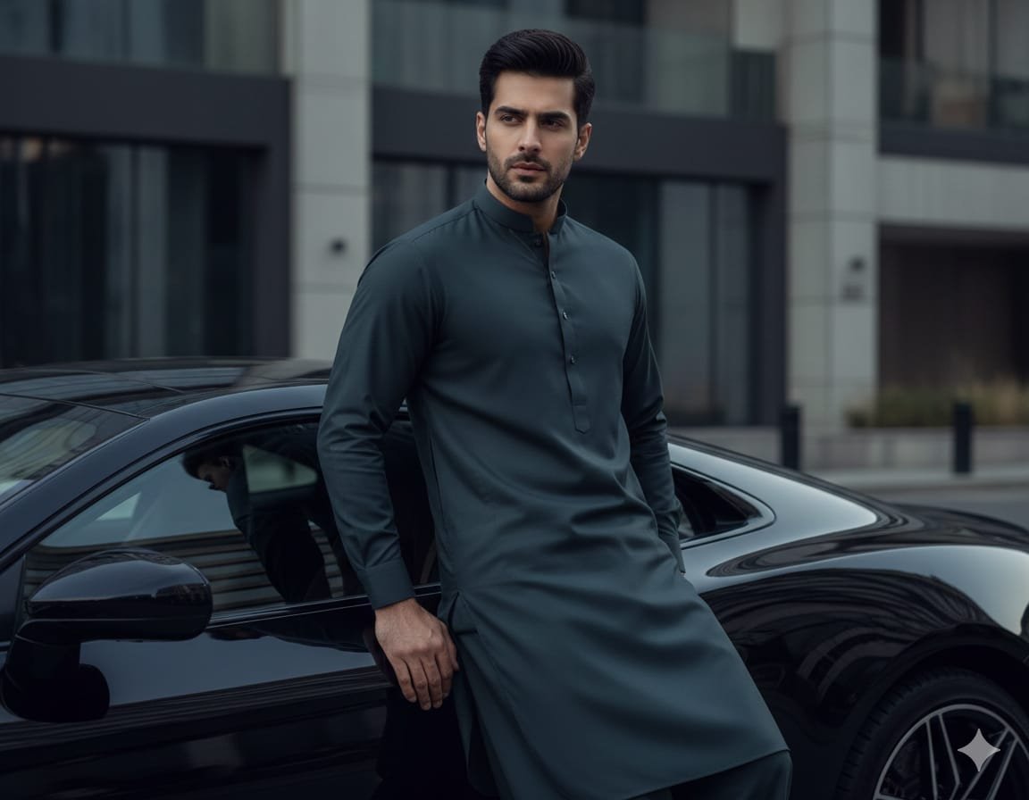 Elegant Teal River Bed fabric designed for a sharp, modern Shalwar Kameez or suit look.